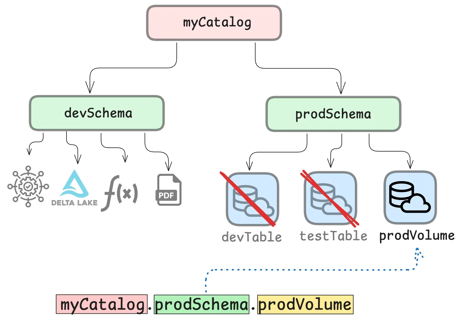 Unity catalog uses a universal hierarchical namespace to locate your data. The namespace has three levels: